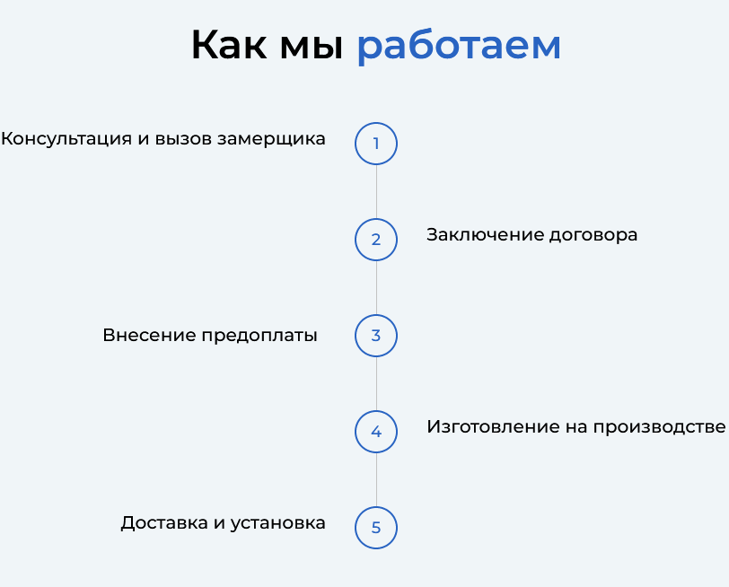 Мы прямой производитель и можем гарантировать высокое качество и лучшие цены в Екатеринбурге на все наши изделия. Заказы выполняются точно в срок, без задержек и оправданий. Оказываем полный комплекс всех работ: начиная от консультации и замера и заканчивая полным циклом производства, с последующей доставкой и монтажом. На все изделия и работы — мы предоставляем фирменную гарантию до 5 лет.